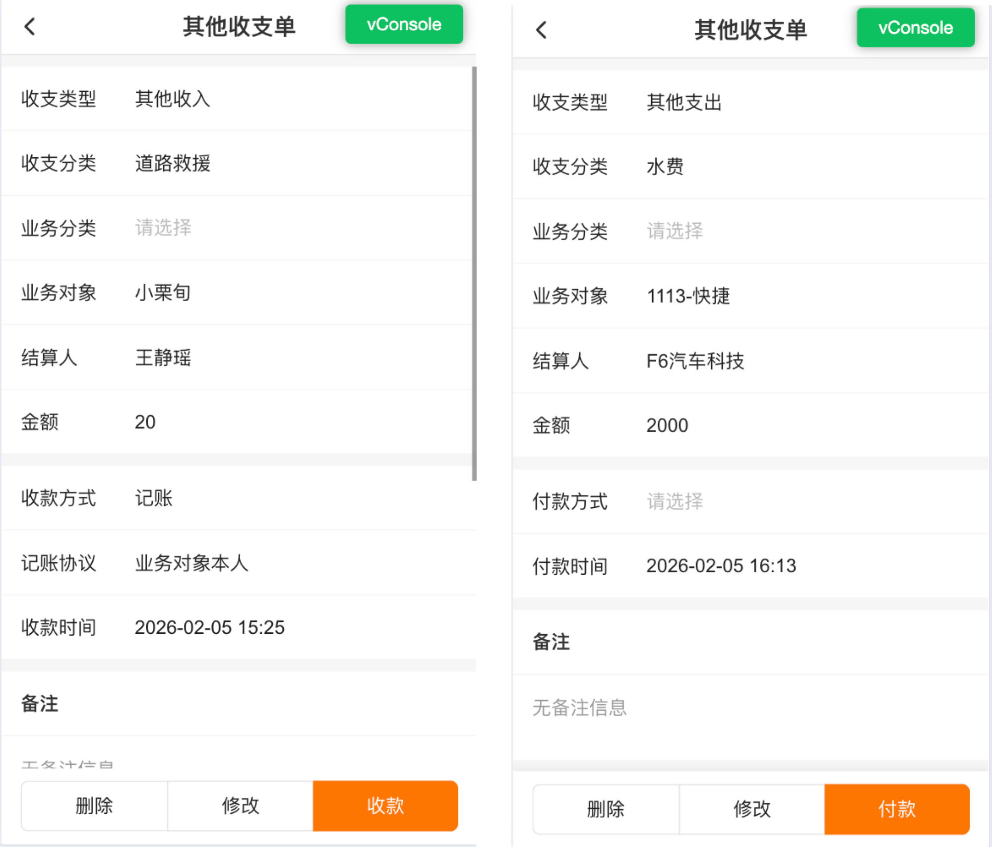 【系统升级】2026年2月5日更新功能 PC端【工单】理赔单/维修单/贴膜单,支持“调拨单”中的材料加入到工单App端【其他收支】支持查看、新建、修改、收/付款、删除更多应用-财务管理:其他收支,可查看门店已创建的收入和支出列表新建/修改其他收入或支出查看其他收入或支出详情,可收款或付款收/付款后,支持审核、订正修改或删除【检测单】支持无线打印【卡】开卡充值支持车主扫码 系统升级清单