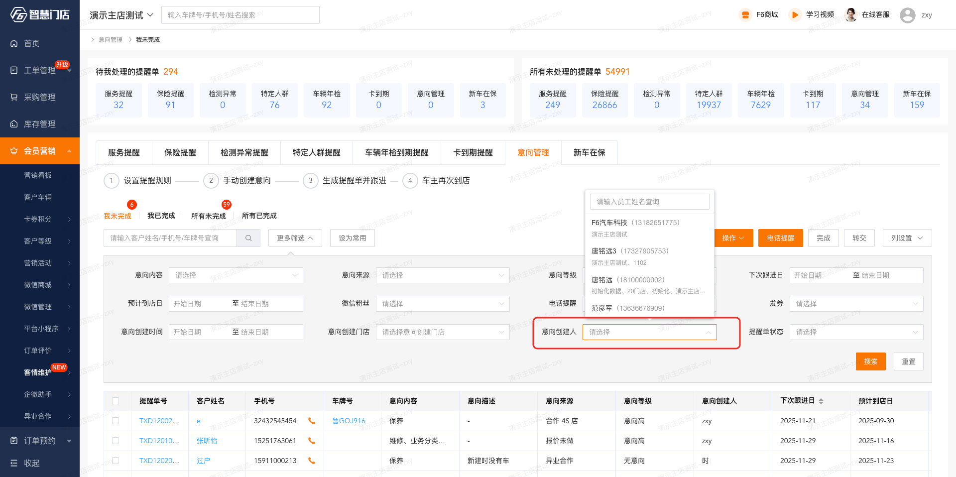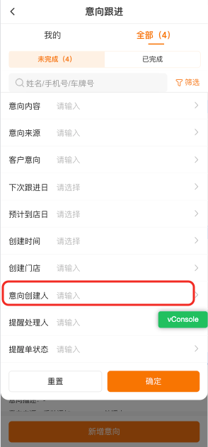 【意向管理】意向提醒列表,支持意向创建人筛选
