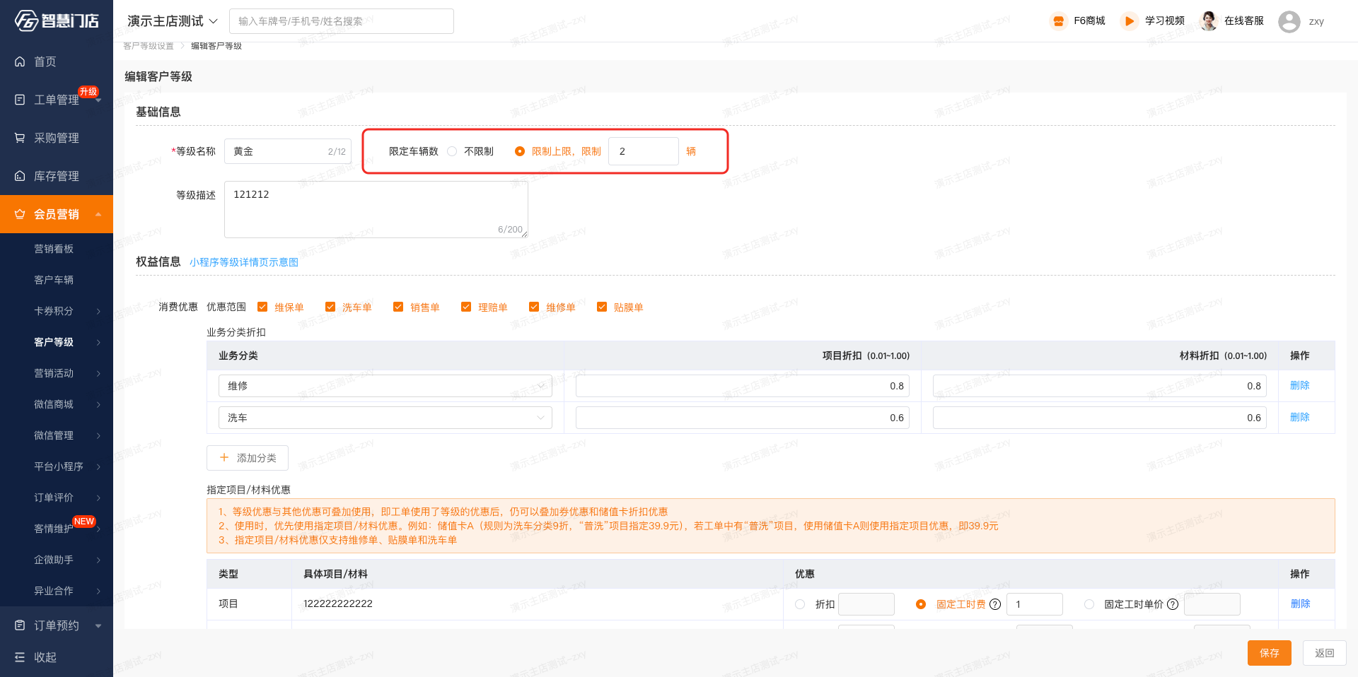 - 配置了限定车辆数的等级,客户开通该等级后,可自主设置等级优惠的可用车辆,且绑定车辆数量不得超过该等级设定的上限。