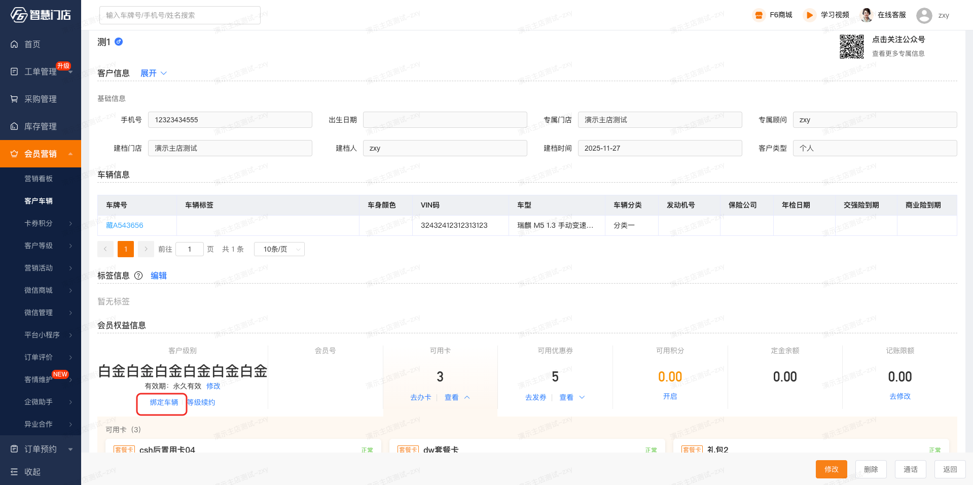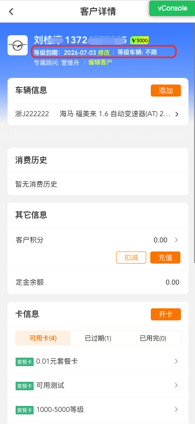- 客户详情页支持手动修改等级绑定车辆,操作该功能需配置 “等级优惠车辆修改”权限。