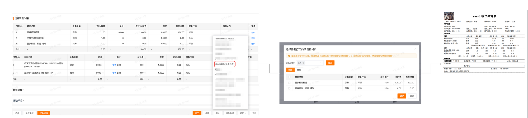 【维修单、贴膜单、洗车单、理赔单】结算单模板,支持指定项目和材料打印