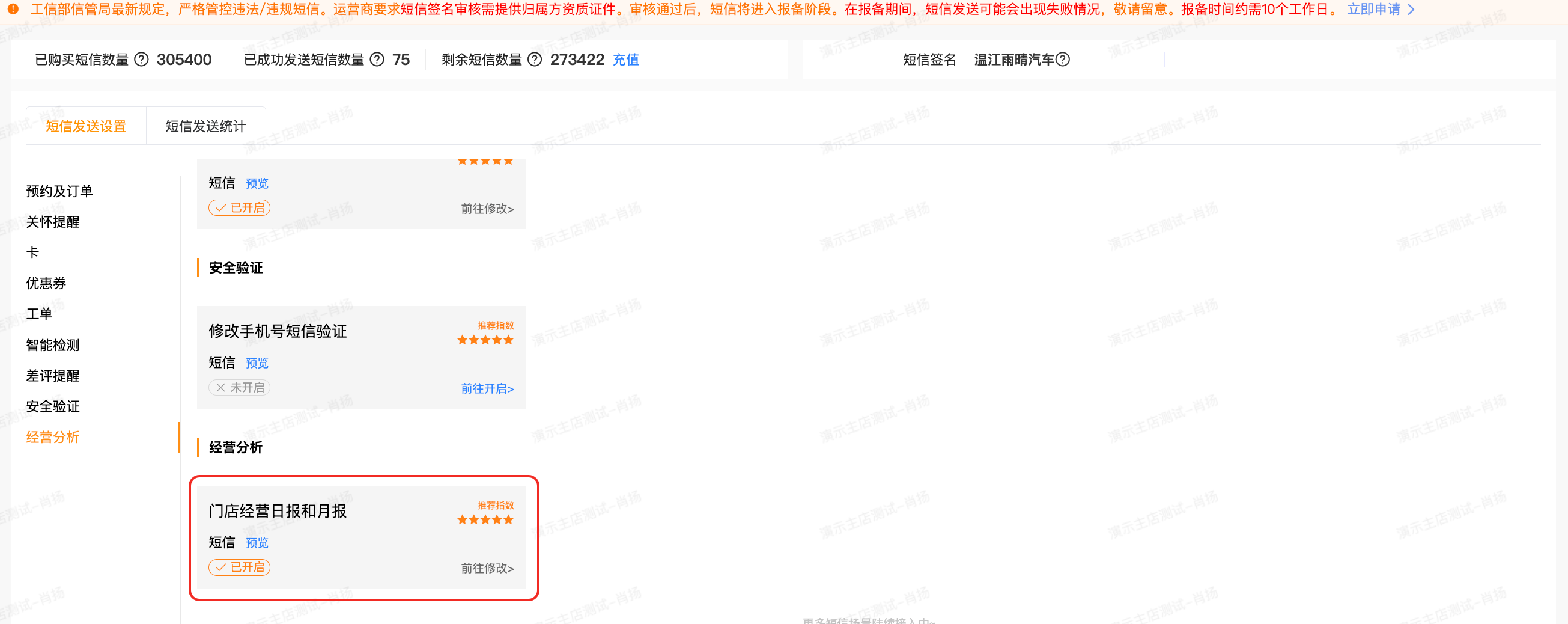 - 开启短信后,给门店管理员&店长,每日定时推送门店经营日报和月报,及时关注门店经营情况