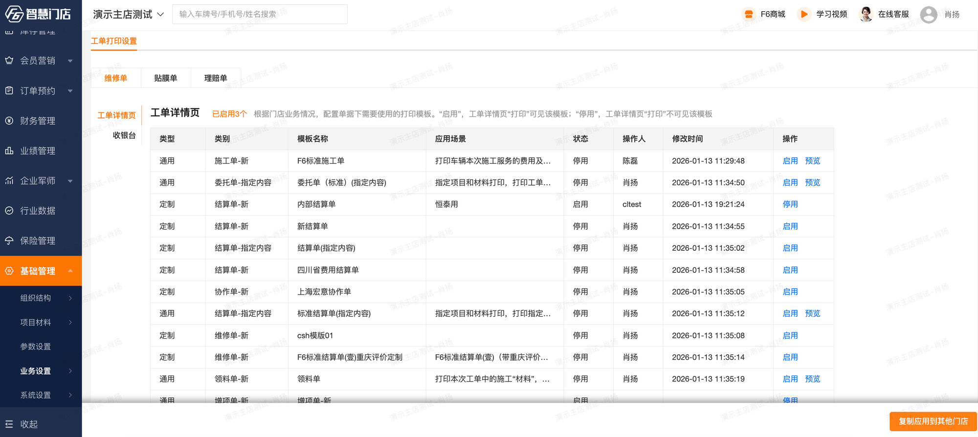 【打印模板配置】“维修单、理赔单、贴膜单”打印模板,支持门店配置启停用
