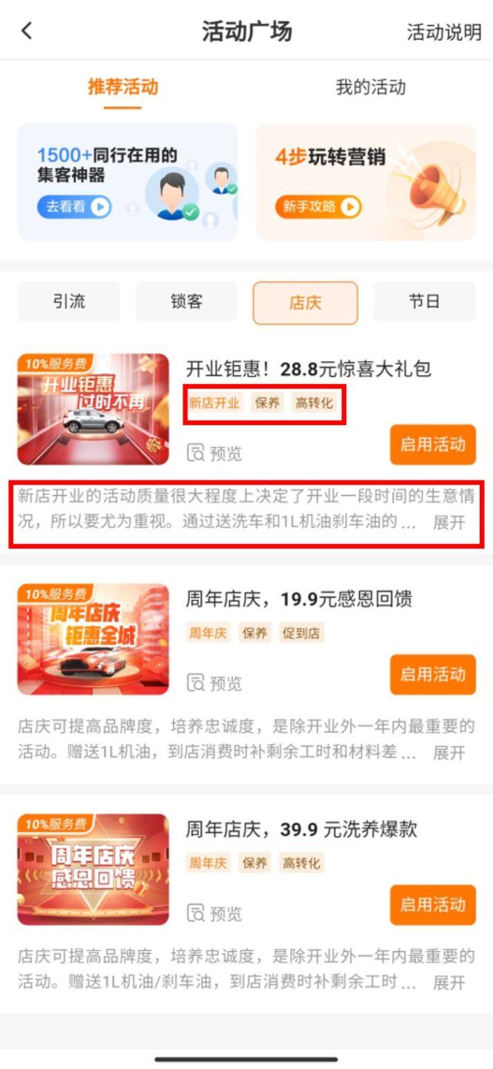 2. 以第一个活动为例,“新店开业”指适用于新开业的门店;活动上打的“保养”标签指的是该活动主要是以保养业务为主;“高转化”标签指的是,活动中搭配的套餐,车主购买参与到店做服务时,能有效促成增项转化;